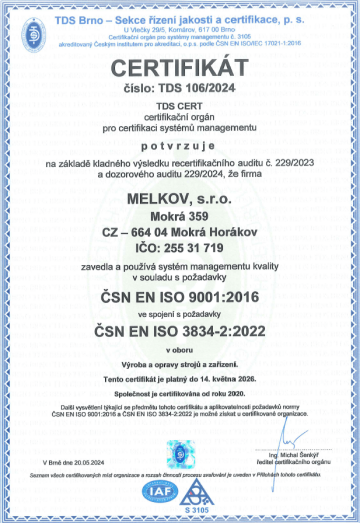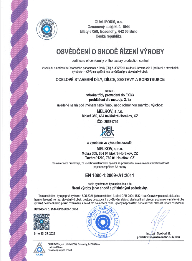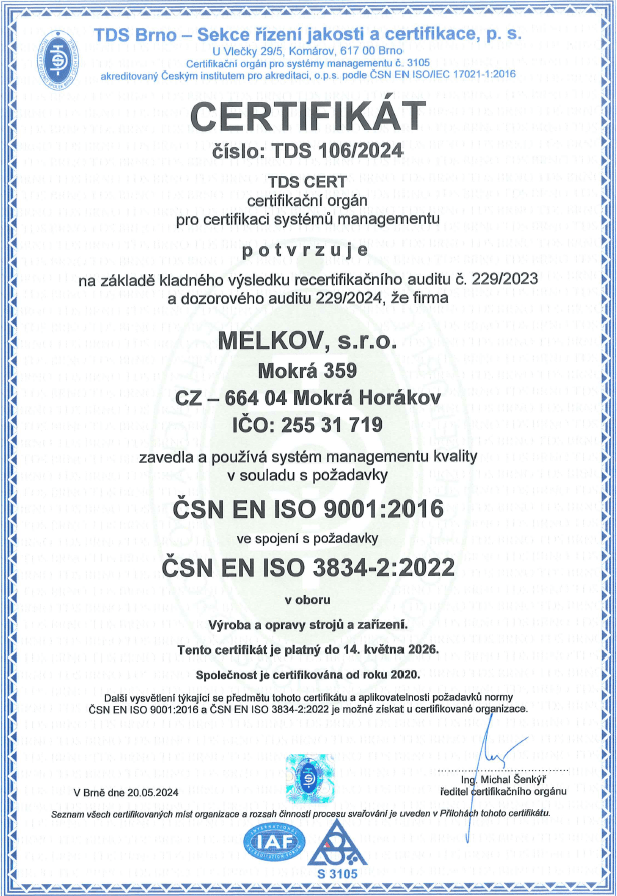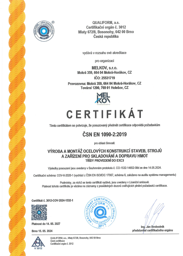 Jsme držiteli certifikátů ISO 9001:2016 ve spojení s ČSN EN ISO 3834-2:2022. ČSN EN 1090-2-2:2019.